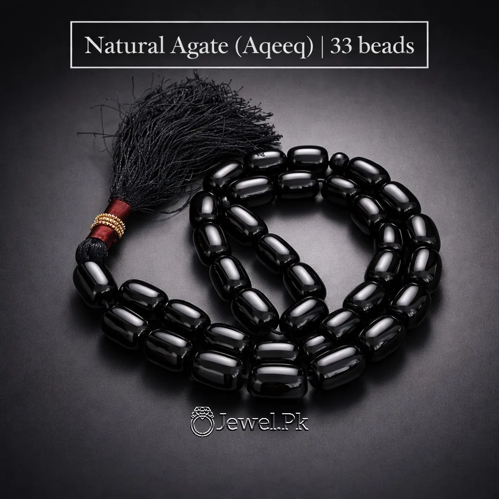Each bead is made from authentic natural black agate (Aqeeq), polished to a smooth, glossy finish. Black Aqeeq is highly valued in Islamic tradition for its spiritual benefits and is often worn or used during prayer for protection, strength, and inner peace.