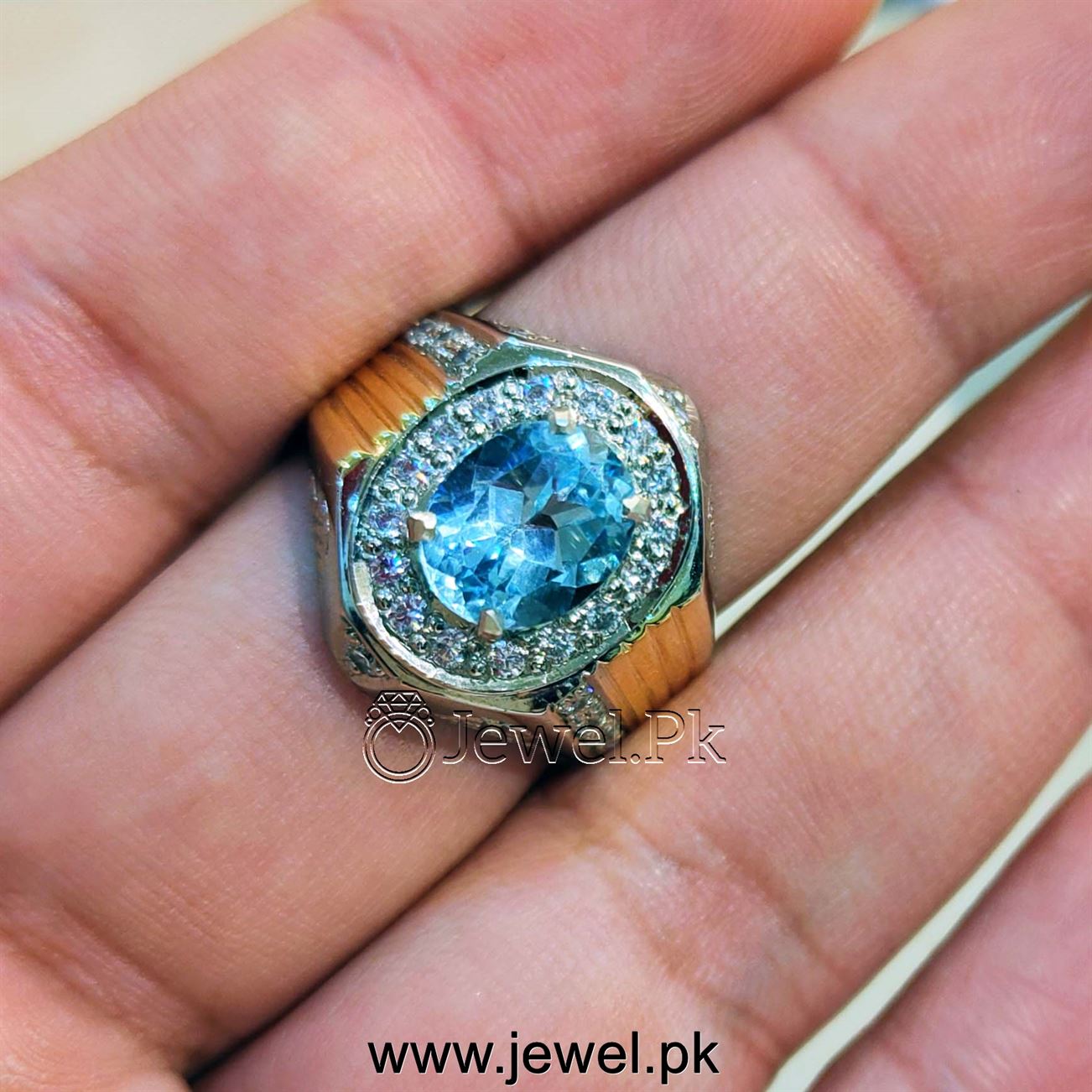 - Halo design around the topaz stone