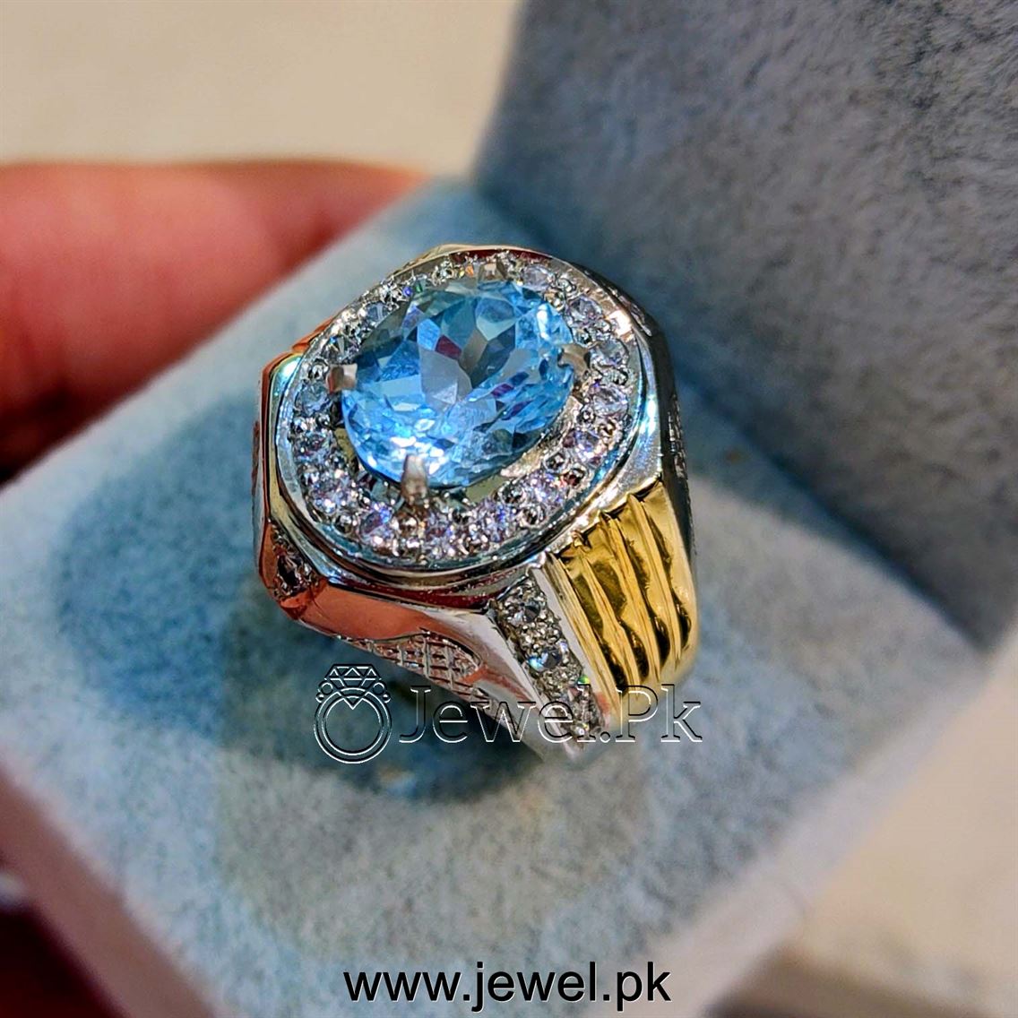 - Natural Swiss blue topaz stone as centerpiece